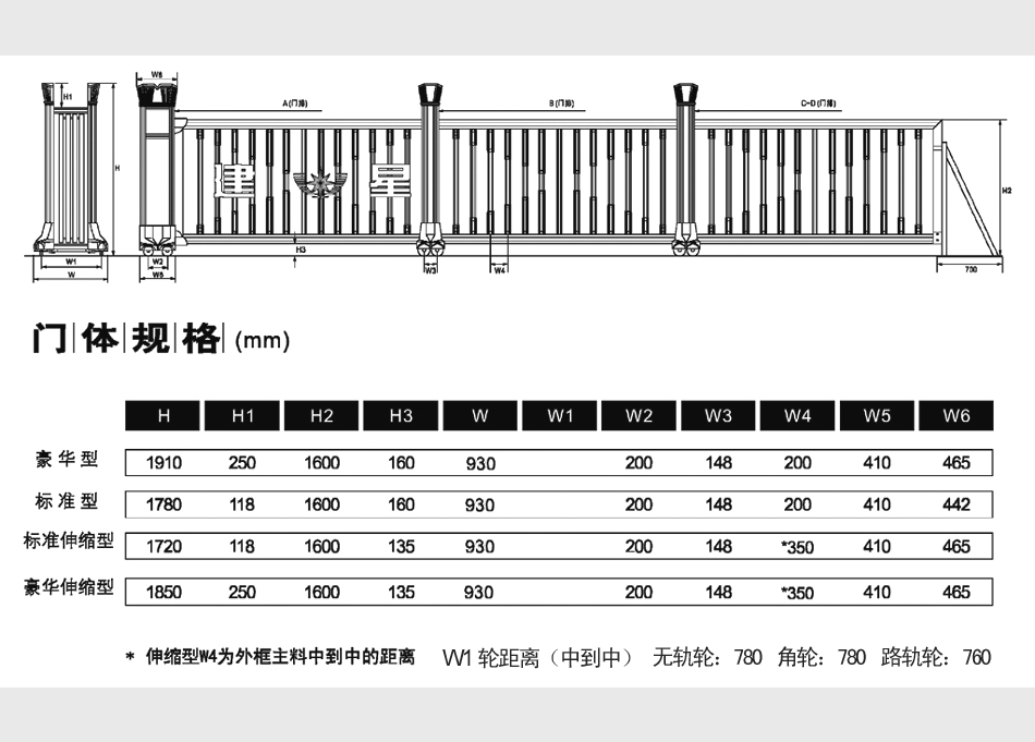 门体主框采用粗壮合金铝型材制造,承重力强,不易变形,支撑门体的立柱为超大型合金铝制成,有很好的支撑力,抗风及抗推撞力强,每立柱由双轴四轮承托,保证门体运行平稳,顺畅。